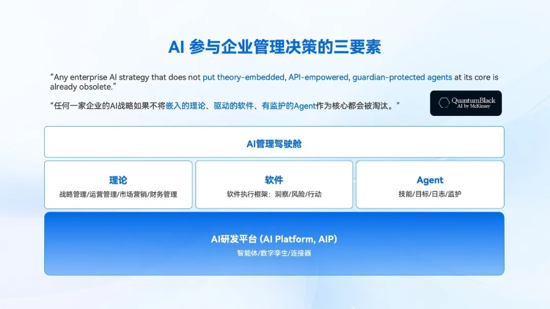 麥肯錫的AI團隊QuantumBlack提出企業AI戰略需建立于三個基礎條件上:理論嵌入、API授權和監護規則保護。API授權確保AI與軟件深度融合;監護規則保護界定AI工作權限范圍:哪些事務可直接執行、哪些需授權審批。從軟件工程視角,API授權和監護規則保護均屬系統范疇。因此,企業AI戰略的核心本質即理論、軟件、智能體三環節結合。