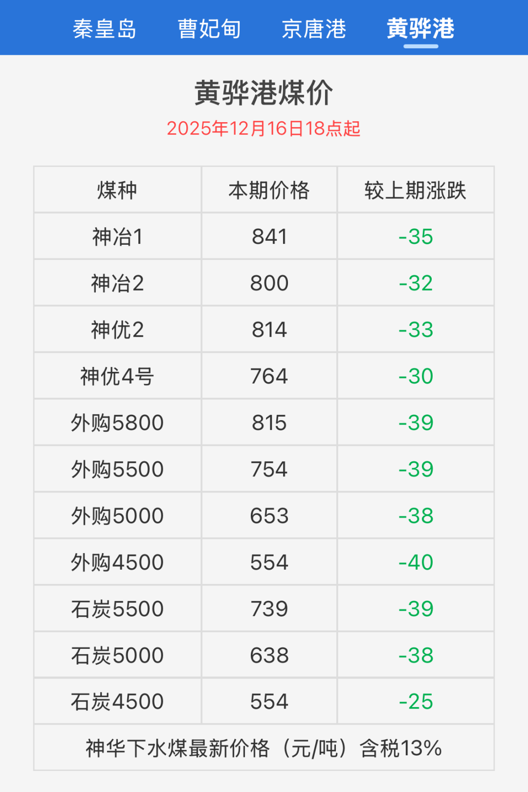 12月16日黃驊港神華下水煤價格下降25-40元/噸截圖