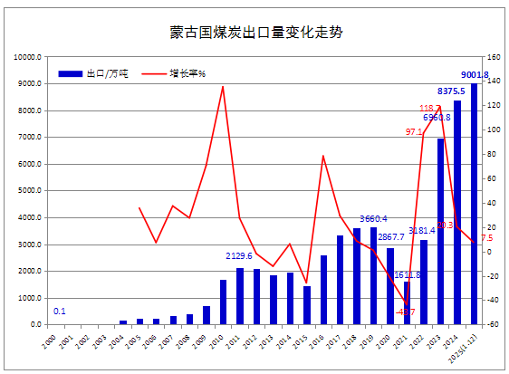 據蒙古國海關機構(Mongolian Customs Service)發布的統計數據顯示,2025年1-12月,蒙古國煤炭出口量累計達到9001.82萬噸,首次突破9000萬噸關口,創出歷史新紀錄,比上年同期增加626.3萬噸,同比增長7.5%。
