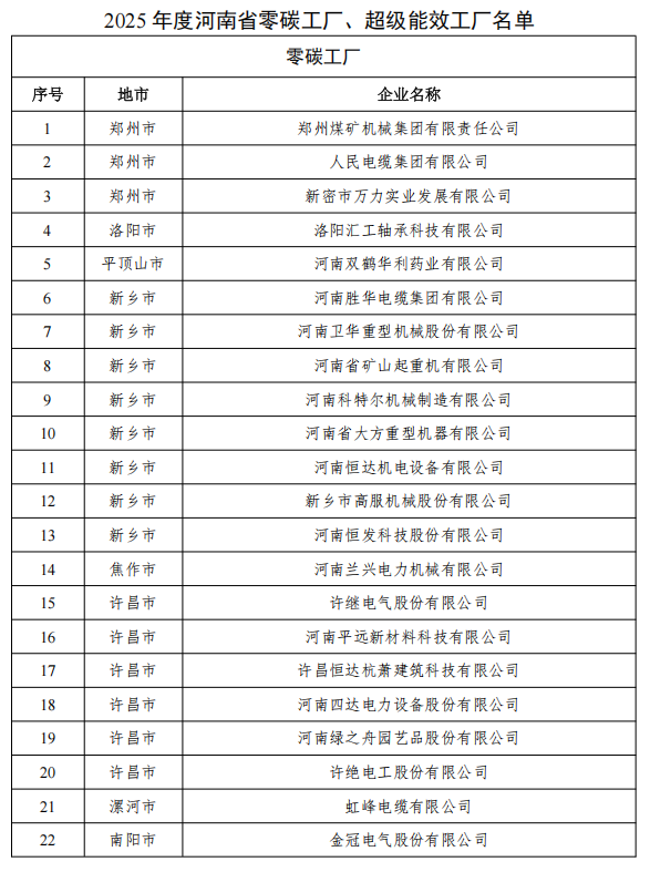 根據省政府關于節能降碳工作安排部署,經自主申報、地市推薦、專家評審、社會公示等程序,確定鄭州煤礦機械集團有限責任公司等24家企業為2025年度河南省零碳工廠,河南明泰鋁業股份有限公司等14家企業為2025年度河南省超級能效工廠,現予公布。
