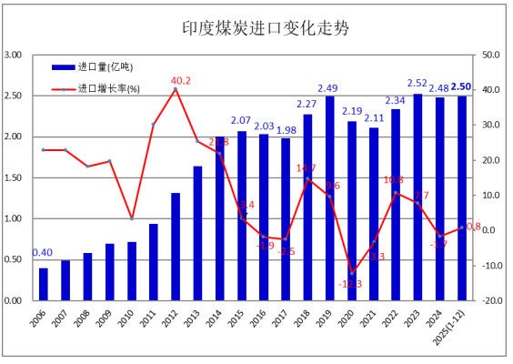 國內煤炭產量增長。盡管2025年印度國內煤炭產量僅微增1.06%,大約為10億噸,但上述兩個因素仍然確保了對進口依賴的下降,保持了較低的動力煤進口需求。