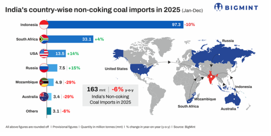 據印度BigMint 平臺網站發布的信息,2025年1-12月,印度進口用于發電和工業領域的動力煤(Non-coking coal,非焦煤)為1.63億噸,較上年同期的1.73億噸下降約6%。