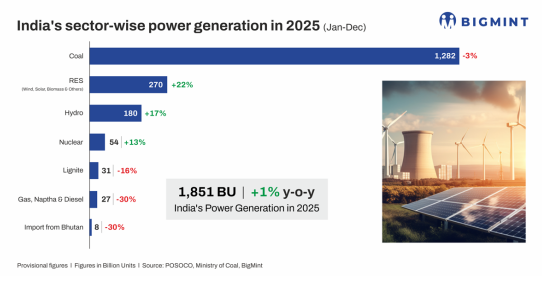 煤炭發電下降。2025年,受夏季氣溫溫和及季風期延長導致空調需求下降9.8%影響,印度燃煤發電量較2024年下滑3%,按照國際能源署(IEA)編制的自1971年起的燃煤發電數據,2025年印度燃煤發電量下降僅是過去50多年來出現全年下降的第二次。因此,用于發電的動力煤進口需求也一直沉悶。