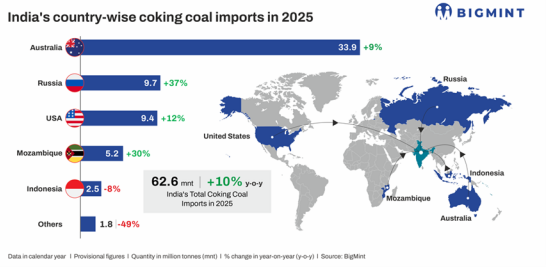 BigMint 平臺發布的信息還顯示,2025年,印度進口冶金煤數量達到8310萬噸,較2024年同期的7600萬噸增長9.4%。其中,焦煤(Coking coal)進口量為6260萬噸,較2024年的5700多萬噸增長10%;其余部分由噴吹煤(PCI煤)構成,2025年噴吹煤進口量超過2100萬噸。