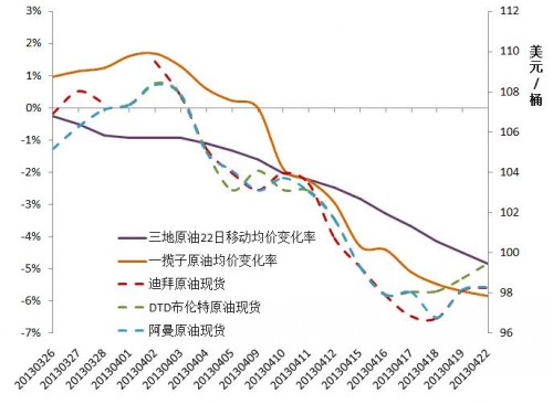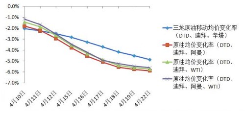 按照新機(jī)制,模擬計(jì)算一攬子油價變化率,和舊機(jī)制的三地原油移動均價變化率對比,可以看出:新機(jī)制下參考指標(biāo)的走勢與國際油價更加契合,與原油聯(lián)動性大大加強(qiáng)。從下圖可以看出,三地(DTD、迪拜、辛塔)原油22日移動均價變化率4月22日為-4.86%,低于新華社石油價格系統(tǒng)發(fā)布的一攬子原油均價變化率;與DTD、阿曼、迪拜三種原油價格相比,三地率曲線走勢明顯更平緩,對原油價格變化的敏感度比一攬子原油均價變化率要低。