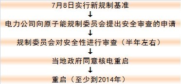 但根據(jù)核電重啟的程序,核電重啟預(yù)計(jì)最早可能也要到2014年。日本核電重啟程序如下圖所示。