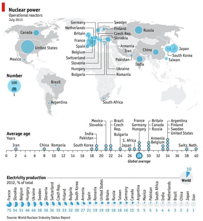 全球共有30(原文為31,中國能源網數據為30)個國家使用核能為其生產生活提供動力。歐洲的核電已占據整個歐洲發電量的30%。2012年,全球只有一座新的核反應堆被啟用,但今年僅半年時間全球已有14座投入使用。