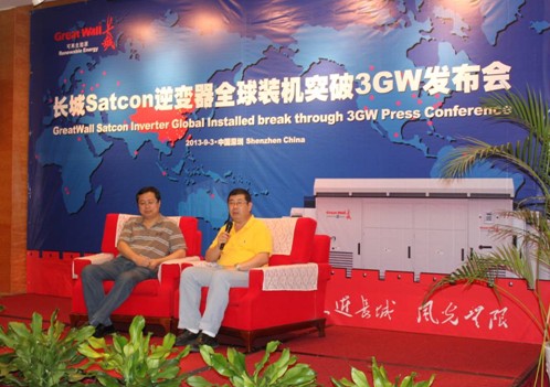 2013年9月3日,深圳市深航國際酒店深航廳人聲鼎沸,深圳中電長城能源有限公司(簡稱長城能源)"長城Satcon逆變器全球裝機量突破3GW"新聞發布會在這里隆重舉行。來自太陽能、電力等領域的專家、領導齊聚一堂,共同見證了這一歷史時刻。長城電腦總裁兼長城能源董事長、總裁周庚申等領導共同出席了此次發布儀式。
