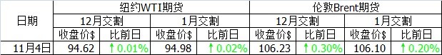 上一個交易日國際油價大跌,紐約WTI油價跌穿95美元大關。但11月4日,紐約WTI油價和倫敦布倫特油價均暫時止住了跌勢。