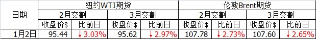 1月2日國際石油期貨價格大跌。美元當日對歐元走強,以美元定價的原油價格給人以較高的感覺,促使油價下行。另外,中國國家統計局公布的12月PMI數據低于前一月,這也利空油價。美國經濟數據空多交織,首次申請失業保險人數比前一周小幅改善,減少2000人至33.9萬人,但美國供給管理協會公布的12月美國制造業PMI為57.0,低于前一月的57.3。