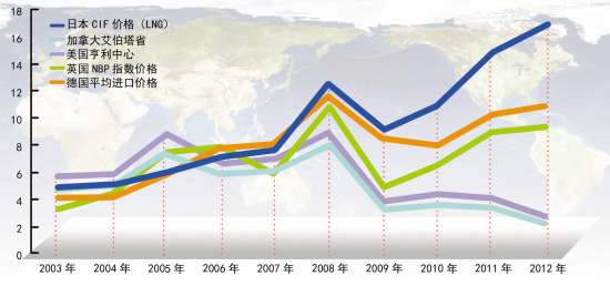 2012年,日本LNG進口價格為16.75美元/MBtu,美國天然氣進口價格為2.75美元/MBtu,加拿大為2.27美元/MBtu,歐洲現貨價格為9.46美元/MBtu。2011年,亞太地區的天然氣價格是北美市場的3.8倍,到2012年則上漲到6倍之多。