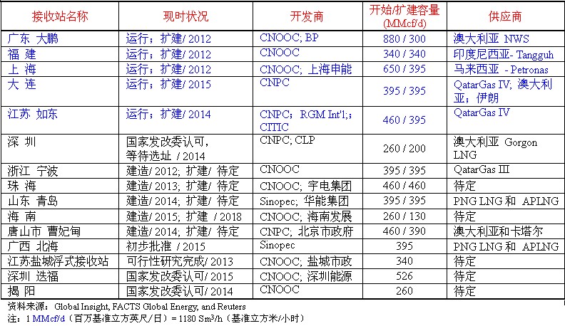中國大陸對液化天然氣的需求量很大,從2006年開始進口液化天然氣。2012年比2011年增加20%,今后還會將繼續增加。主要按照合同來源于卡塔爾、澳大利亞、印度尼西亞和馬來西亞,其他的均為短期合同和轉口貿易。目前,中國運行的液化天然氣接收站并不多,只有5個,但建設速度較快。