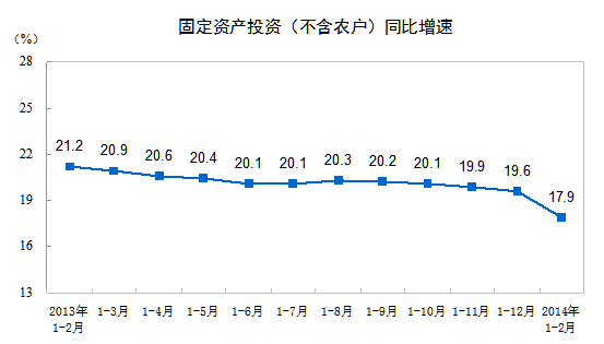 統計局網站今日公布數據顯示:2014年1-2月份全國固定資產投資(不含農戶)增長17.9%。全文如下:
