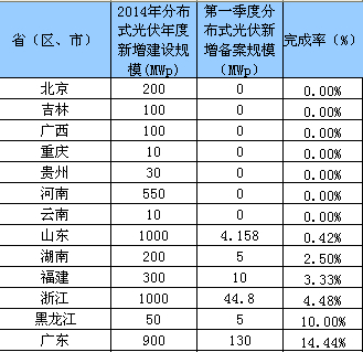 山東作為分布式光伏發展大省,2014年第一季度新增分布式備案容量僅0.415萬千瓦,約占年度規模的0.42%。此外,浙江省2014年度分布式光伏建設指導規模為100萬千瓦,而第一季度僅新增備案4.48萬千瓦;廣東第一季度分布式光伏建設情況較好,但新增備案容量也僅有13萬千瓦。(具體情況見下表)。