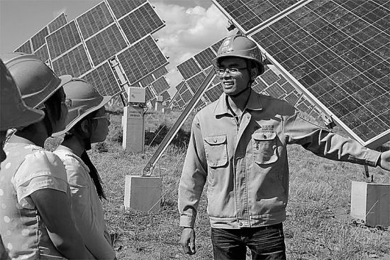 “這些藍色的面板就是太陽能組件。”該電站的光伏主管翟化欣指著一塊塊的多晶硅太陽能電池說,這些面板是由一個個的半導體“硅”組成,他們就像一個個的“小吸收員”,盡情地吸收著金色的陽光,繼而源源不斷地輸出電能。