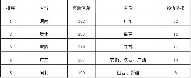 表三 2014年7月有效信息與投訴舉報排名前5位省份情況