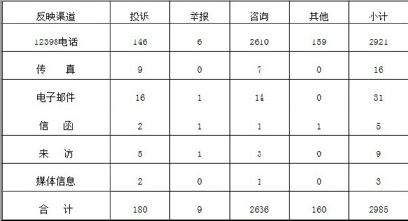按反映渠道分類,12398電話2921件,傳真16件,電子郵件31件,信函5件,來訪9件,媒體信息3件。(2014年7月收到有效信息情況見表一)