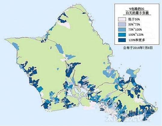 夏威夷電力擁有遍布瓦胡島的416條電路。在上個月,其中約20%的電路在白天的最低負載(DML)為120%多,如圖深藍色區域,因此,在那些服務區很少或沒有額外的光伏發電被接受。約23%的電路在75~120%的DML范圍內,合計占43%的HECO電路的總和。此外,光伏產能目前的水平對整個島電網的影響不只是特定的電路。非技術用語翻譯:近一半的夏威夷電力線路在網格設計和管理上都達到或超過了光伏滲透率的臨界點。這促使更嚴格的審查和討論了今天的電力基礎設施的實際和技術的限制去進一步超越目前最大閥值。