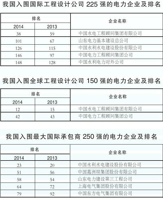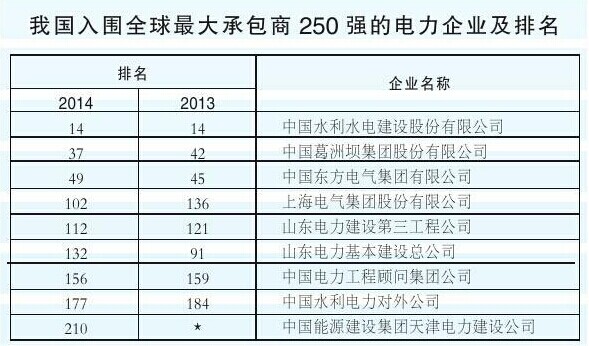 日前,2014年度美國《工程新聞記錄》(ENR)“全球最大承包商250強”、“最大國際承包商250強”、“全球工程設計公司150強”和“國際工程設計公司225強”榜單揭曉。中國水電工程顧問集團有限公司、中國電力工程顧問集團公司、中國葛洲壩集團股份有限公司等電力建設企業榜上有名。
