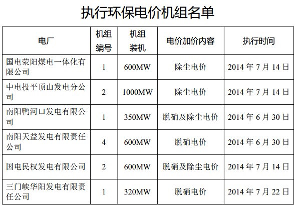 國(guó)電滎陽(yáng)煤電一體化有限公司等發(fā)電企業(yè)部分機(jī)組環(huán)保設(shè)施已通過(guò)省環(huán)保廳驗(yàn)收。按照《河南省發(fā)展和改革委員會(huì)河南省環(huán)境保護(hù)廳關(guān)于轉(zhuǎn)發(fā)燃煤發(fā)電機(jī)組環(huán)保電價(jià)及環(huán)保設(shè)施運(yùn)行監(jiān)管辦法的通知》(豫發(fā)改價(jià)管﹝2014﹞720 號(hào))規(guī)定,脫硝設(shè)施達(dá)標(biāo)運(yùn)行的上網(wǎng)電量每千瓦時(shí)提高 0.01 元,除塵設(shè)施達(dá)標(biāo)運(yùn)行的上網(wǎng)電量每千瓦時(shí)提高 0.002 元。執(zhí)行脫硝電價(jià)、除塵電價(jià)的機(jī)組名單及執(zhí)行時(shí)間見(jiàn)附件。