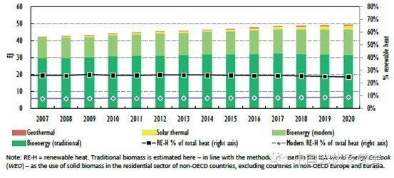 全球可再生能源供熱(包括傳統(tǒng)生物質(zhì)燃料)到2020年預(yù)計將達到49.7EJ[1](每年1%的增長率)。以此同時,由于城鎮(zhèn)化和現(xiàn)代供能手段的發(fā)展,傳統(tǒng)生物質(zhì)能源的使用量在大多數(shù)費OECD國家中將大幅減少,新型可再生能源供熱量將由2013年的14.5EJ增長到2020年的17.9EJ.