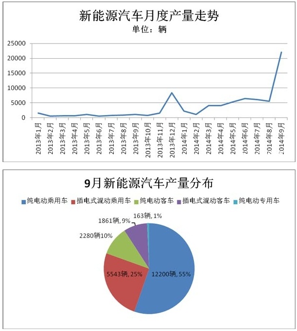 截至9月,2014年的總新能源汽車產量已達60404輛,比去年同期的7564輛增長了698.57%。2013年全年新能源汽車的產量為1.75萬輛,銷量1.76萬輛。2014年全年的產銷量同比大增已成定局。不過,9月受購置稅因素影響過大,有此前產銷累積釋放效應,10月、11月恐怕難以維持如此量級。但是每年12月都是新能源汽車產銷的高點,因此,全年中國新能源汽車產銷將達到第一電動網年初預測的上限——8萬輛甚至更高。