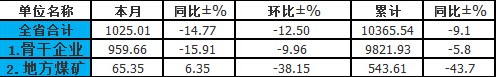 其中,骨干企業產量959.66萬噸,同比減少181.51萬噸,下降15.91%,環比減少106.14萬噸,下降9.96%。1-9月累計生產煤炭9821.93萬噸,同比減少609.30萬噸,下降5.8%。