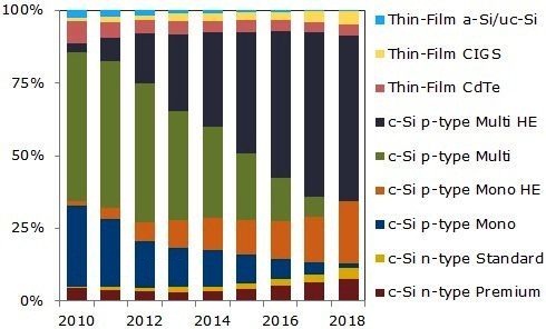 基于使用高純提拉法(CZ)生長和太陽能專用定向凝固爐鑄錠制造的多種晶硅技術(shù)之間的競爭,將最終決定哪些技術(shù)在未來五年內(nèi)將獲得成功。NPD Solarbuzz的報告顯示,先進的晶硅電池概念預(yù)計將占更大的市場比例。2015年后,已知的先進晶硅模塊供貨商市場規(guī)模預(yù)計將成長200%,到2018年達到7.6 GW。