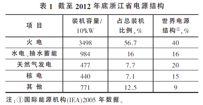 浙江省作為東部沿海經濟發達省份,能源需求隨著工業化、城市化、現代化進程的不斷推進而突飛猛進。截至2012年底,浙江省電力總裝機容量為6170×10^4kW,電源結構見表1。