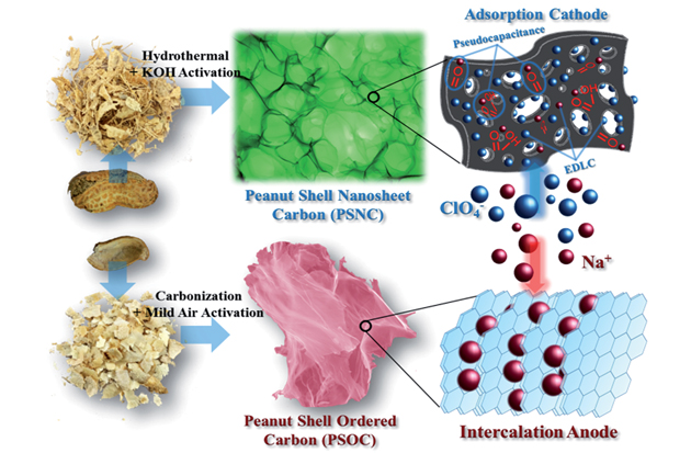 那么,為什么用花生殼作母體呢?Mitlin說,他們容易得到、價格低廉且商業用途有限,他們最終的歸宿多是垃圾填埋場。然而,花生殼并不是隨意被選擇的,是課題組認為花生殼內外的重要結構特征分別是理想陽極和陰極材料所需要具備的。花生殼內部主要由高度交聯的木質素聚合物構成,使其適于組裝擴張石墨烯層,以嵌入鈉離子作為高效陽極。陰極是一種具有高表面積的石墨烯狀材料,由富含纖維素的異質花生外殼合成。