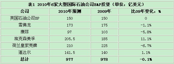 調查顯示,2010年國際大石油公司在北美E&P投資將有所下降,但在北美以外地區的投資將有小幅度增長。預計全球6大國際石油公司在全球E&P投資將減少0.1%(表1),其中BP、雪佛龍和道達爾與2009年基本持平,康菲和殼牌分別下降5.8%和6.7%,而埃埃克森美孚則增長11.1%。