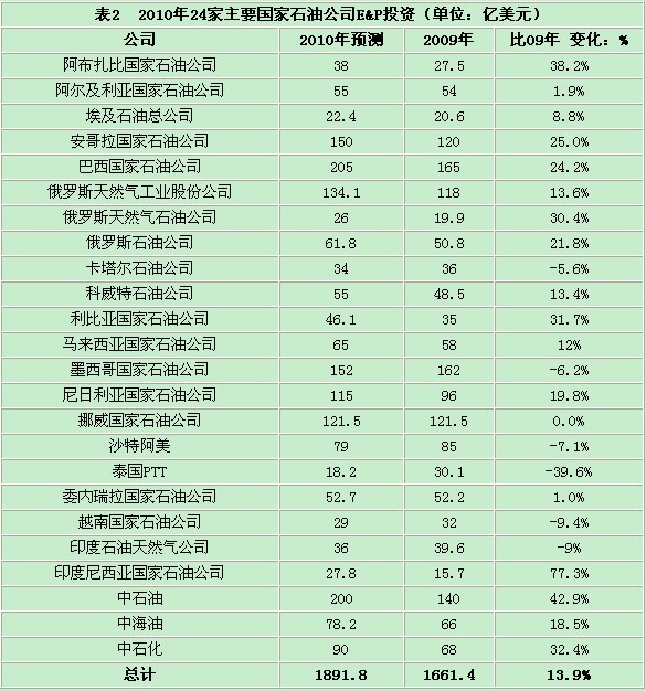 二、2010年國際大石油公司E&P投資預計與上年持平,而國家石油公司E&P投資將大幅增長