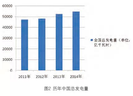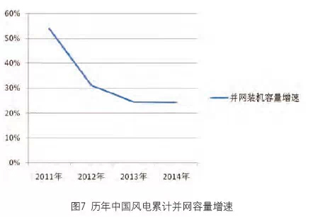 然而,由圖4可以看出,2014年中國風電上網電量的增長幅度在與歷年相比時,明顯處于下降趨勢。其增幅雖然超過了10%,但與2011年、2012年的增幅超過40%相差甚遠。與其相比,中國全國發電量的增幅下降并沒有那么明顯,雖然歷年總體也呈現下降的趨勢。