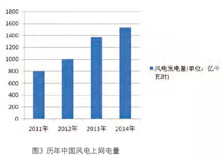 圖5顯示的是歷年中國風電上網電量占全國發電量的比例,由2011年的1.67%到2014年2.8%,呈現逐年增加的趨勢。