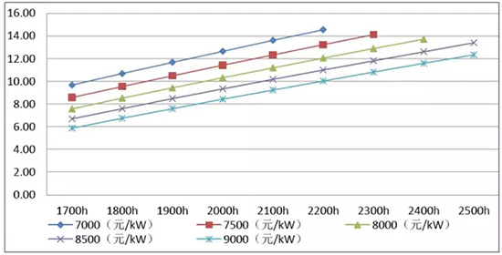 當滿發(fā)小時數(shù)達到2000小時,則單位千瓦靜態(tài)投資不超過9000元/kW即能保障全部投資內(nèi)部收益率不低于8%。