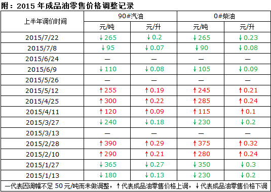 ICIS安迅思2015年7月21日訊——根據國家發改委本周二(7月21日)下午17時發布的通知,汽柴油最高零售價下調兌現,其中汽、柴油均下調265元/噸,折合升價分別是0.2元/升和0.23元/升,調價執行時間為7月21日24時。2015年7月內的兩次成品油零售調價,分別為7月7日24時與7月21日24時,均以下調落幕。
