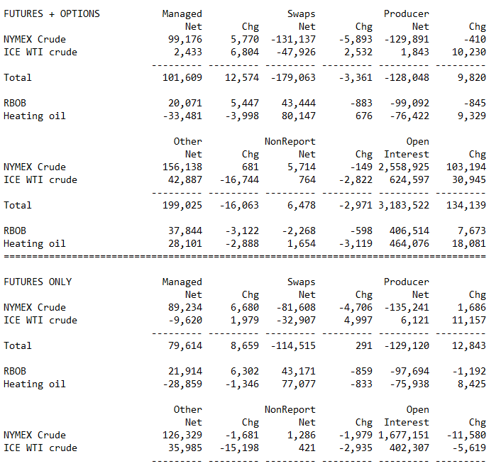以下數(shù)據(jù)為扣除了紐約商品交易所(NYMEX)金融交易員金融原油頭寸之后的原油期貨合約,而這通常是包含在我們的總數(shù)之內(nèi)的。商品期貨交易委員會(huì)(CFTC)本周沒(méi)有提供此數(shù)據(jù)。