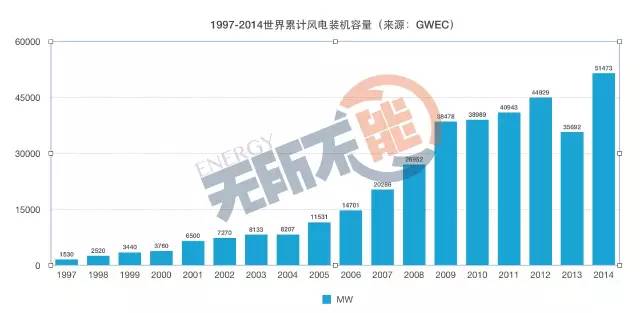 8.1997~2014世界年度風(fēng)電裝機量