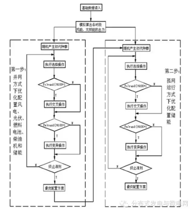 本發明公開了一種微電網電源的優化規劃及評估方法,在并網和孤島兩種運行方式下,分別建立了微電網內分布式電源優化規劃的數學模型,考慮了柴油發電機啟動和運行的約束條件,獲得科學的風電、光伏、燃料電池、柴油發電機和儲能的容量的優化配置,采用遺傳和粒子群算法對微電網內部的電源進行了優化規劃;并建立了包含穩定電源占比、總投資、儲能的時移電量、電源容量充裕度、柴油發電機最長運行時間的規劃方案評估方法,保證了規劃方法的正確性和規劃結果的合理性。