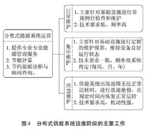 在分布式供能系統(tǒng)調(diào)試完畢,開啟計費周期時即進入系統(tǒng)運維階段。分布式能源運維是確保供能系統(tǒng)安全、穩(wěn)定、高效運行,減少投資商經(jīng)濟損失的重要環(huán)節(jié),其主要包括產(chǎn)能設(shè)備、供能設(shè)施、通信系統(tǒng)等多個設(shè)備和系統(tǒng)的巡檢和維護管理工作,以及節(jié)能率測試、節(jié)能咨詢和增值服務(wù)等工作。總的來講,即是對整個供能網(wǎng)絡(luò)、系統(tǒng)、數(shù)據(jù)庫等軟件和硬件進行日常維護、集中維護、應急維護,并對供能系統(tǒng)使用過程中業(yè)主的問題進行答疑,能及時報告、排除、處理運營故障和事故,確保安全、可靠地供能。本著“預防為主、防治結(jié)合,防止供能中斷”的原則,分布式供能系統(tǒng)運維的主要工作內(nèi)容如圖4所示。