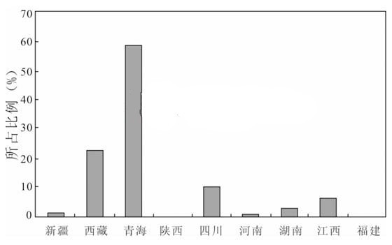 中國鋰礦資源豐富, 礦床多,規(guī)模大,是我國的優(yōu)勢礦產(chǎn)之一。統(tǒng)計全國鋰礦床151處,其中超大型3處, 大型10處,中型15處,小型13處, 礦點112處。鋰礦床在空間上的分布具有區(qū)域性集中的趨向,儲量明顯集中在青藏高原,所探明的鋰礦床分布于我國9個省(自治區(qū)),主要集中在青海、西藏、四川、江西等四省,四省合計查明資源儲量占全國鋰查明資源儲量的96%,此外,在湖南、新疆、河南、福建、陜西等5個省亦有產(chǎn)出。其中,四川甲基卡偉晶巖型鋰礦床是我國最大的固體鋰礦, 探明氧化鋰儲量約900000噸。在鹽湖方面,青海察爾汗鹽湖是我國規(guī)模最大的鋰資源產(chǎn)地。