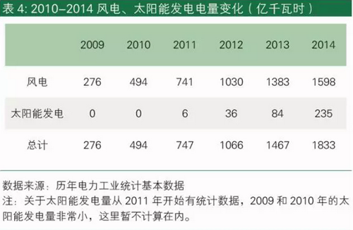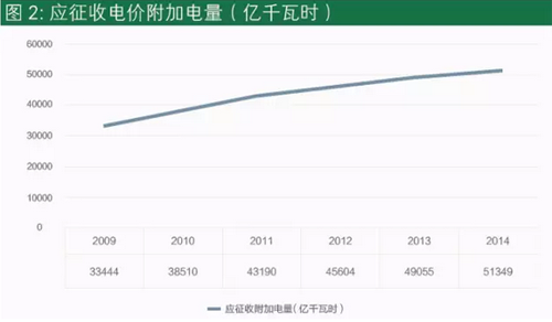 加速提升的電價附加征收標準反映出中國可再生能源發電的快速發展。根據電力企業聯合會的數據,風電發電量從2009年的276億千瓦時,增加到2014年的1598億千瓦時,五年時間增長接近五倍。