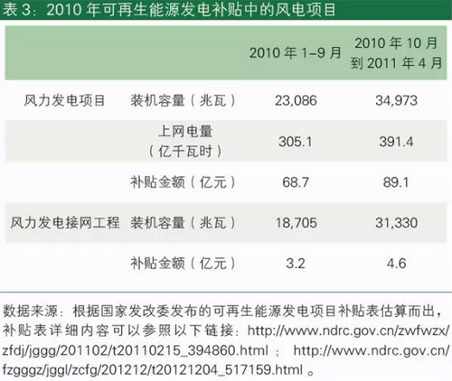 征收的電價附加能否滿足可再生能源電力補貼的需求呢?我們參照發改委發布的數據來看。根據表2顯示,電價附加的主要補貼對象是可再生能源發電項目,接網費用占比很小,約為4.2%。在可再生能源發電項目中占比最多的是風電,因為在2010年,太陽能發電項目還非常少。依據表3,2010年1月-2011年4月,上網風電發電量達到696.5億千瓦時,補貼金額為157.8億元,占到同期可再生能源發電項目補貼額198.4億元的80%。