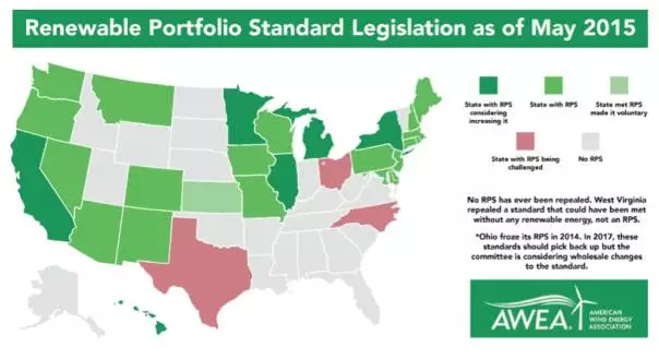美國是第一個實行可再生能源配額制的國家,也是實行可再生能源配額制較為成功的一個國家。截至2015年5月,已有30多個州依據(jù)本州資源、市場、政策背景制定并實施了可再生能源配額制,實施RPS的州和地區(qū)分布如下圖。據(jù)憂思科學(xué)家聯(lián)盟預(yù)測,到2025年,可再生能源配額制將促使美國的可再生能源電力增加76750MW,配額制對可再生能源發(fā)展的促進(jìn)功能由此可見一斑。
