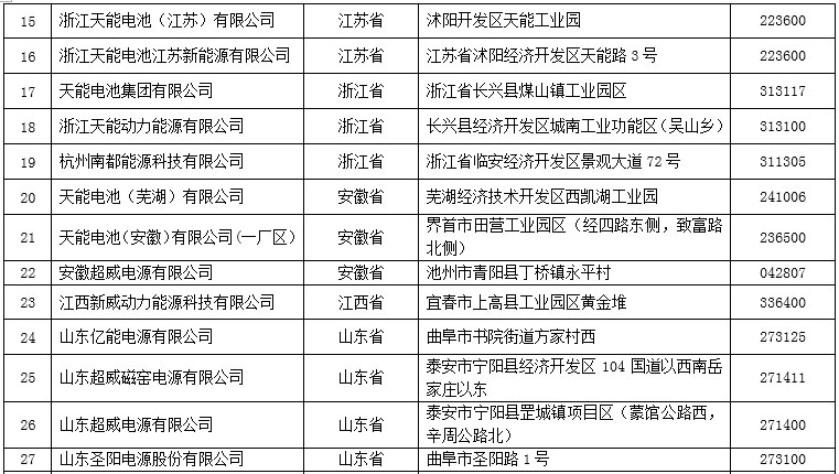 符合《鉛蓄電池行業規范條件(2015年本)》企業名單(第一批)