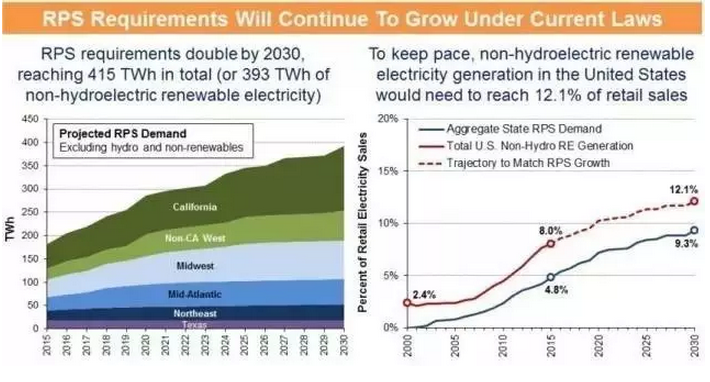 可再生能源配額制總需求將從2015年的215TWh增長到2030年的431TWh;若保持此增長率,新增非水可再生能源發電量需要占電力零售市場的12.1%。