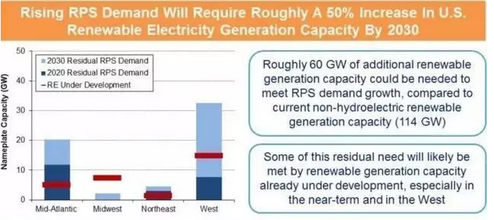 至2030年,可再生能源配額制需求將增加60GW的可再生能源發電量,大約增加為目前非水可再生能源發電量的50%(2015年為114GW)。