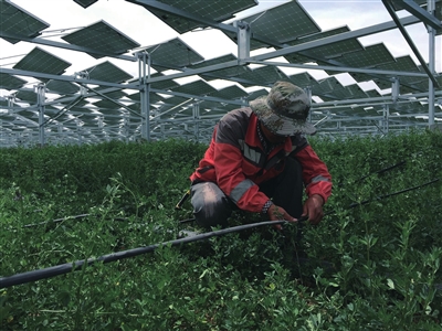 光伏發(fā)電板下,種植的苜蓿長(zhǎng)勢(shì)良好,工作人員正在安裝澆灌苜蓿的水管。本報(bào)記者范曉儒攝
