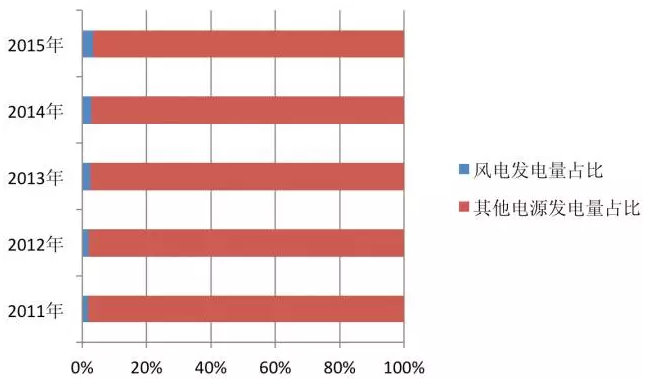 在近五年,風(fēng)電上網(wǎng)電量的增幅一直高于全國(guó)發(fā)電量的增幅,說(shuō)明其在各類電源發(fā)電量中所占的比例不斷提高。2011年時(shí),風(fēng)電上網(wǎng)電量占全國(guó)總發(fā)電量的1.67%,到2015年則已占到3.3%。