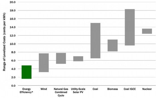 但是,能源節約是長期有效的。勞倫斯伯克利國家實驗室(LBNL)和美國能效經濟理事會(ACEE)的一項最新研究也證明了能效提升所需的成本更低:每千瓦時僅為4.5美分。因此若要讓電力公司實現放棄使用化石燃料、降低碳排放的目標,向用戶投資提升能效比新建太陽能或風能發電項目更實惠。
